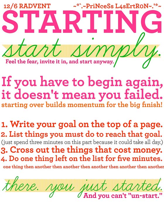Today I am planning on working with Princess Lasertron’s “how to get started” prompts to get my 2012 goals fleshed out. Identifying my mission to “begin to be the person you want to be today” is a daunting task, so these 6 tips will help me move it along. Image re-blogged with permission from Princess […]