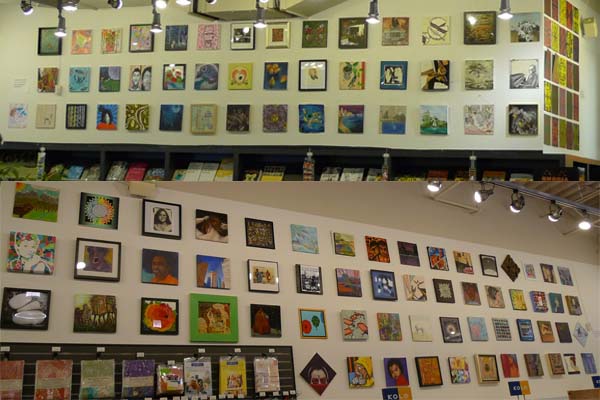 I am not regretting submitting the butterflies to Dick Blick. On Thursday my heart skipped with joy when I saw my 12×12 entry hanging among 148 beautiful pieces. The opening was a madhouse of people shopping for discounts during the Dick Blick Madness sale, but most people did glance up at the walls as well.