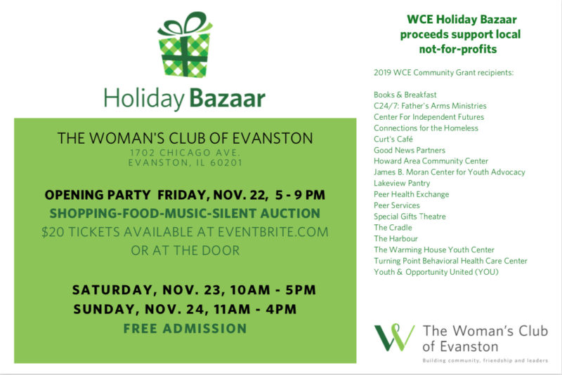 On Friday there will be a Preview Party with some special discounts for shoppers. The tickets for this evening event are $20 and includes appetizers from local restaurants, a glass of wine, silent auction. The Preview Party is Friday, November 22, from 5 pm to 9 pm. There will be free admission on Saturday, November 23 from 10 am to 5 pm and Sunday, November 24 from 11 am to 4 pm. The Woman’s Club of Evanston Club house is located at 1702 Chicago Avenue in Evanston.