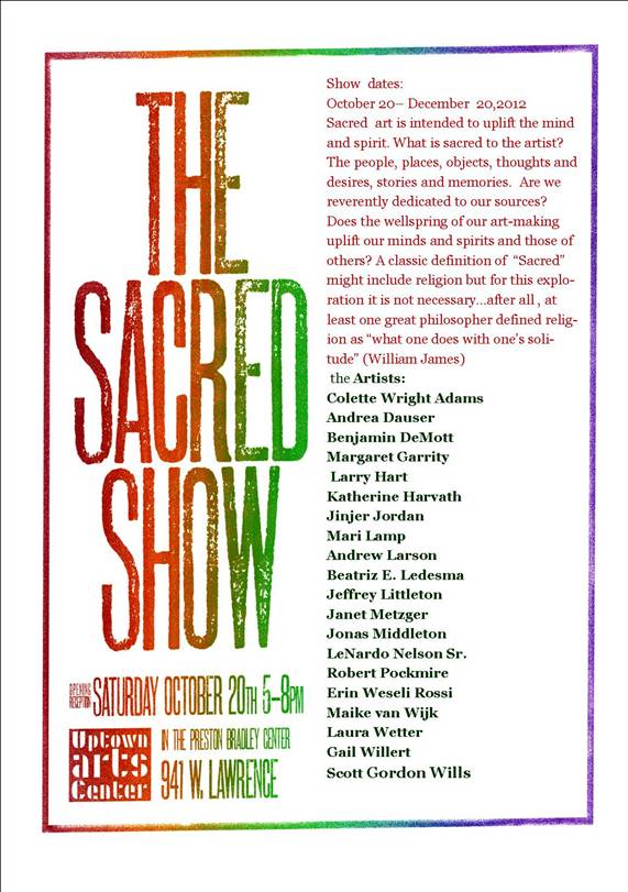 It is such fun to explore the city and discover pockets of artistic support in so many places, especially during Chicago Artists Month. This weekend I dropped off my Sassy Aphrodite at the Uptown Arts Center on Lawrence. She will be part of The Sacred Show, featuring 19 other artists. The Sacred Show, curated by Colette Wright Adams, opens (tomorrow) Saturday, October 20 from 5 p.m. to 8 p.m.