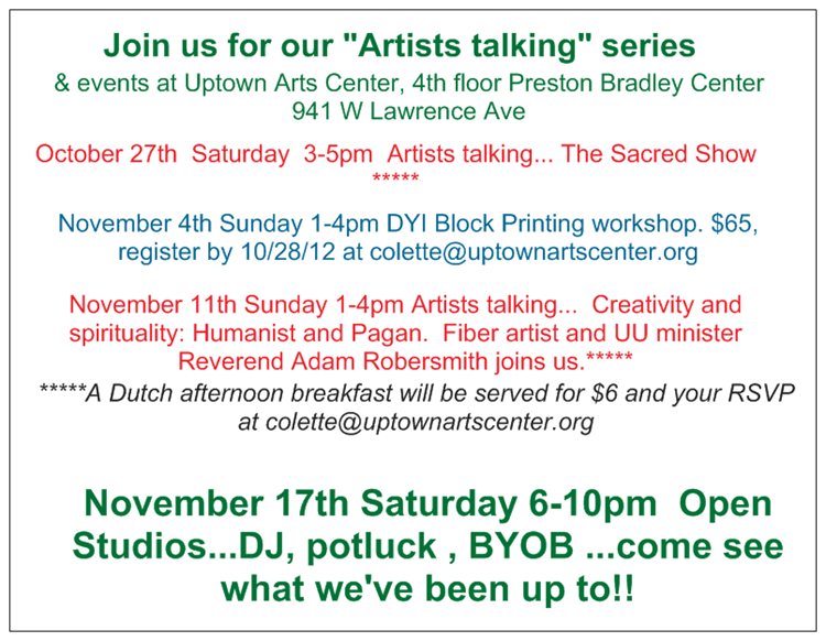 On October 27, the Uptown Art Center will host an Artists Talking session with members of the show, from 3 to 5 p.m. The Artists Talking series continues with fiber artist and UU minister Reverend Adam Robersmith discussing “Creativity and Spirituality: Humanist and Pagan†from 1 to 4 p.m. on Sunday, November 11. An RSVP and $6 for an afternoon breakfast is requested for these events. Additional viewing hours are Saturdays 1 to 4 p.m. or by appointment 773-450-7246, or at an open house November 17 from 6 to 10 p.m.