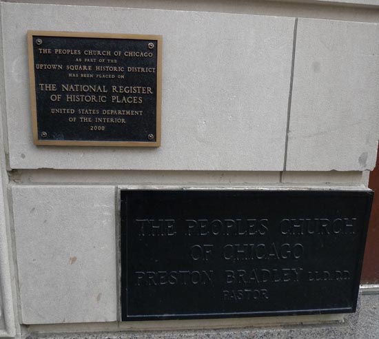 The Preston Bradley Center honors the Peoples Church of Chicago’s pastor, Dr. Preston Bradley, who served the church from 1912 to 1978. Per the web site, he marched with Jane Addams for woman’s suffrage and with Martin Luther King for civil rights. Among the first to broadcast his sermons over the radio, Preston Bradley’s radio ministry inspired the TV show “Guiding Lightâ€.
