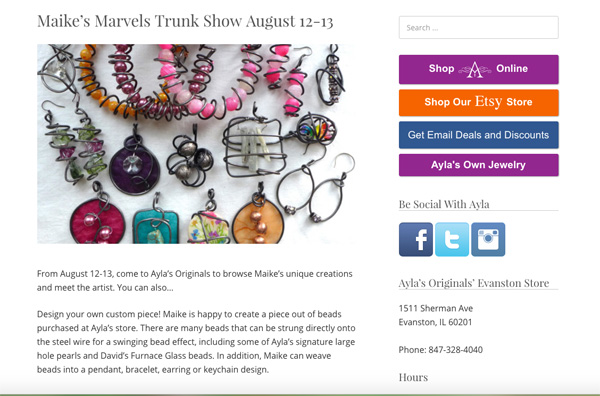 Ayla’s Originals Store is located at 1511 Sherman Avenue in Evanston. Hours are: T,W, F: 10 am to 6 pm; Th: 10 am to 7 pm; Sat. 10 am to 5 pm; Sun 12 to 5 pm. Closed Mondays.