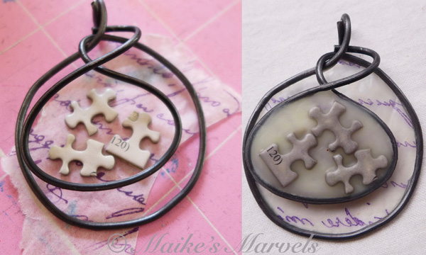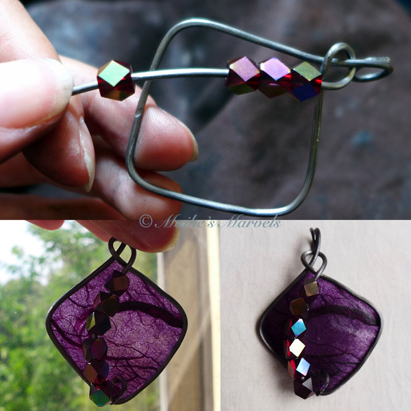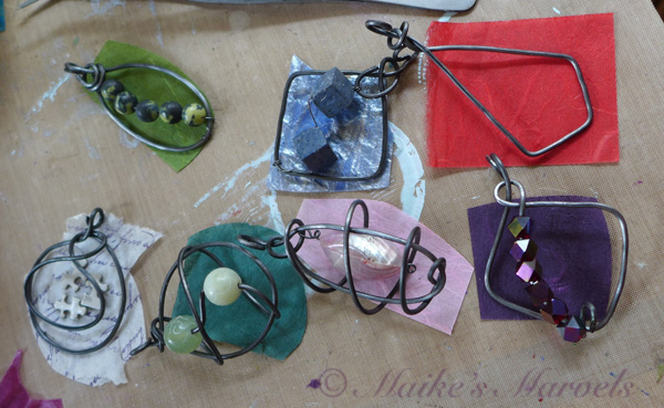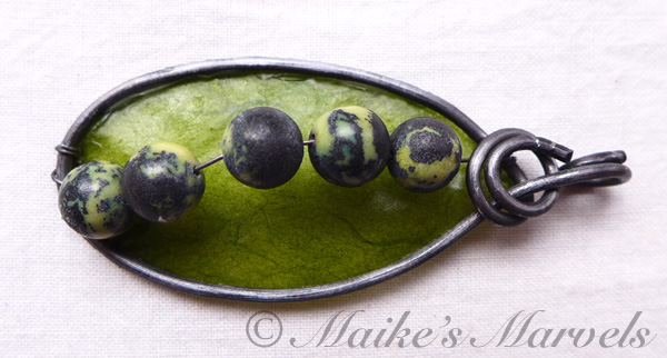 I waxed the pieces, with the cage versions being a bit more challenging than the others. The etched jade also fit the thicker wire, and I am glad my friend and I shared this strand last summer.