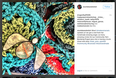 I set up for the show in the morning, and dropped of more yarn bomb doilies next door, where drawing angel hung out for the day to support Stumble & Relish’s guest artist.