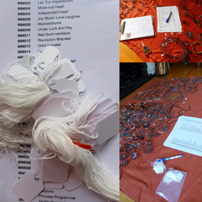 Originally I printed tags because I had to tag hundreds of pieces, but now it is more convenient to handwrite them on pre-punched jewelry tags.
