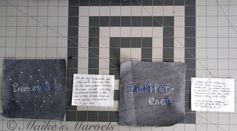 Jason had us stitch denim quilt squares with words that made us feel covered by the Evanston community, as well as contemplate words that had us feeling exposed.