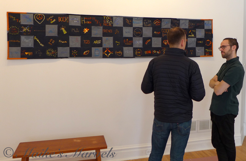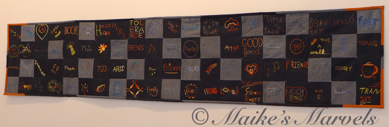 As we perused the quilt more closely we were struck by the deeper meanings of the words, as well as the representation of stitches that added more layering to the meaning of each square.