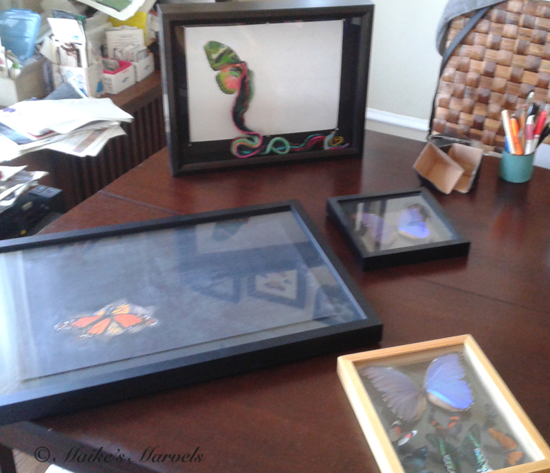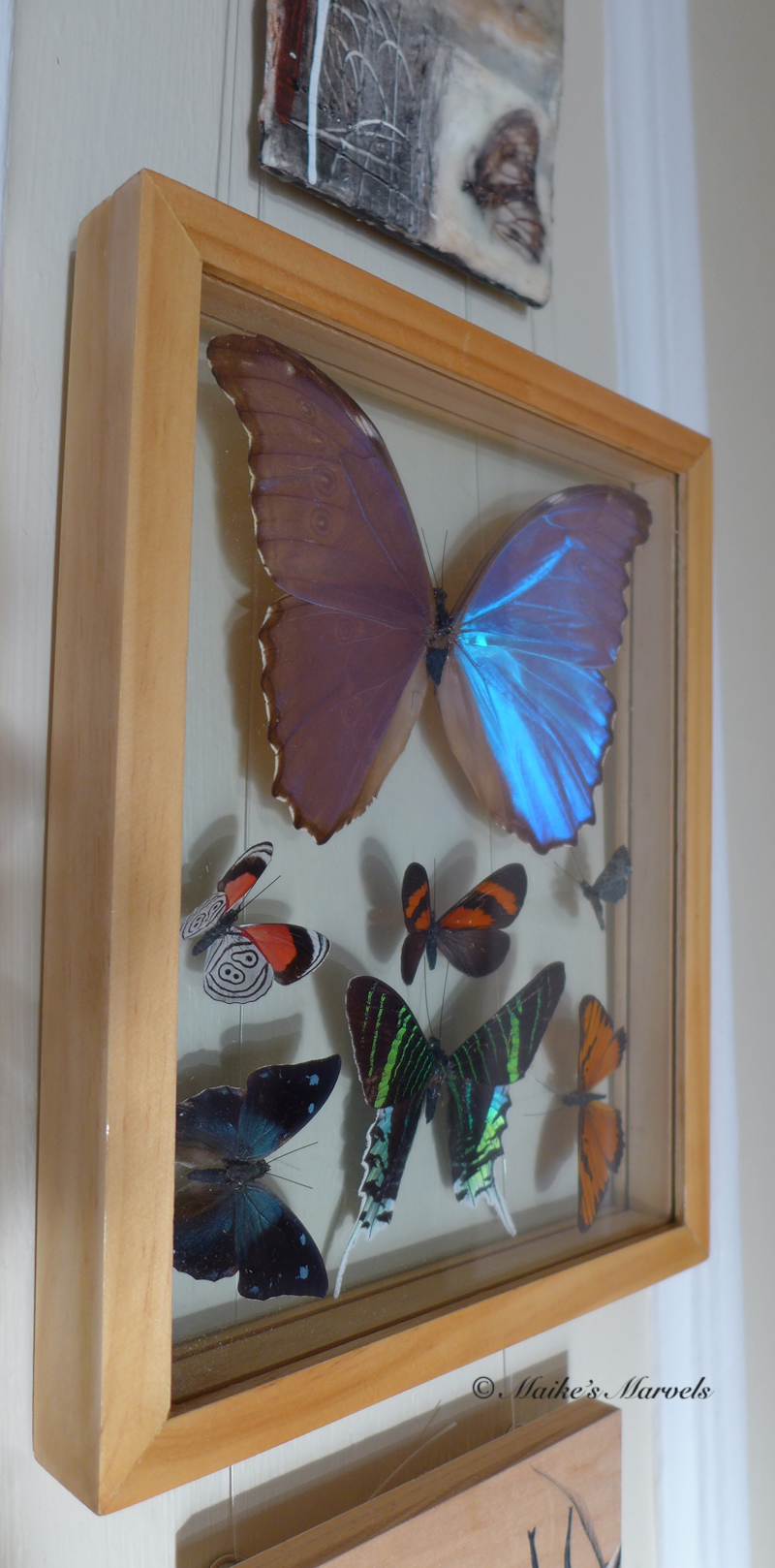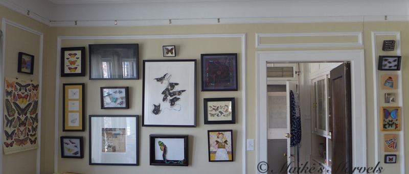 The narrow wall contains a gift from a friend, the buckeyes I raised and pinned, 2 drawings by Lauren Levato Coyne, an encaustic collage by Bridgette Guerzon Mills, exotic butterflies gifted from my brother, and a peacock butterfly. So now my collection is truly full, since I am out of wall space. It is fun to lean back and admire the collection. The play of light throughout the day is fascinating. Soon leaves on the tree next door will create less sparkly effects though.