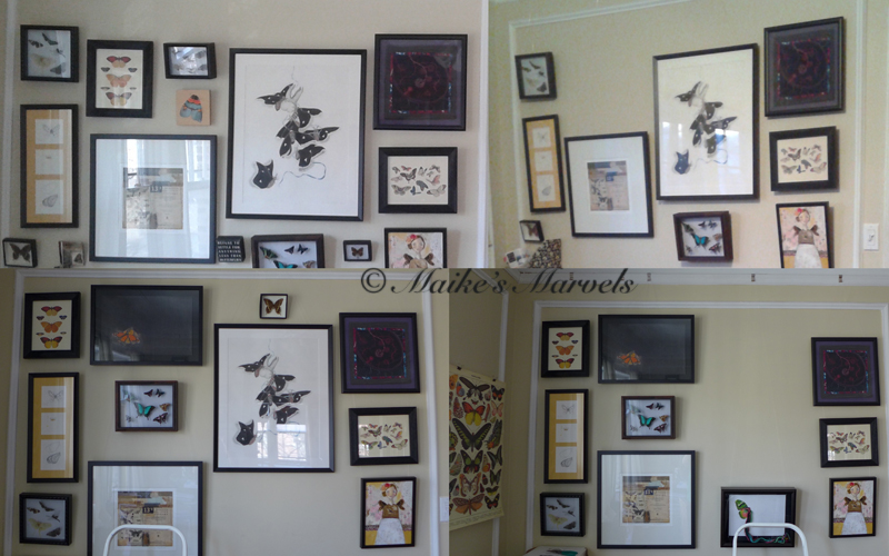 I did a lot of step-ups and step-downs from my ladder to measure the fishing line length, hang, adjust, and rehang each frame. It was fun to see it all come together though, and to have the collection take on a new look with the additions.