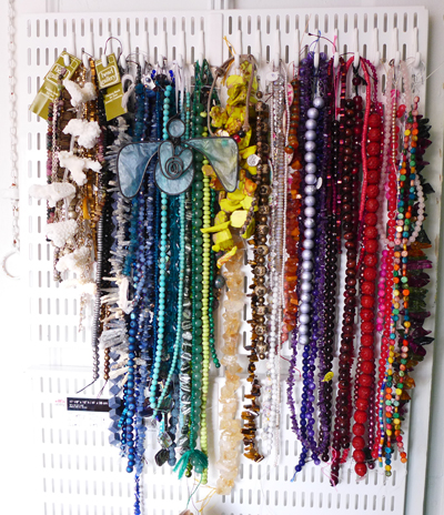 I saw a pegboard wall of beads in a book which this door-installation is perfect for. My beads had been gathering on a tray for years.