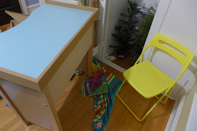 It is pretty telling that with all the documenting I do, I have not taken a single photo of my studio since my last studio view blog post in 2014. As my creations toggled between jewelry making and larger wall collages, I’ve been envisioning an extra table in my space, but wasn’t sure how to make it happen since storage was becoming an issue.