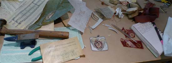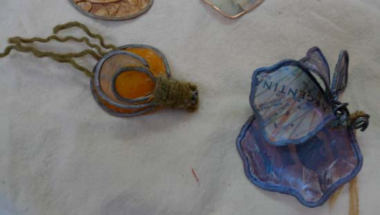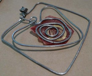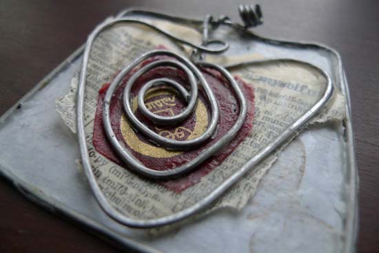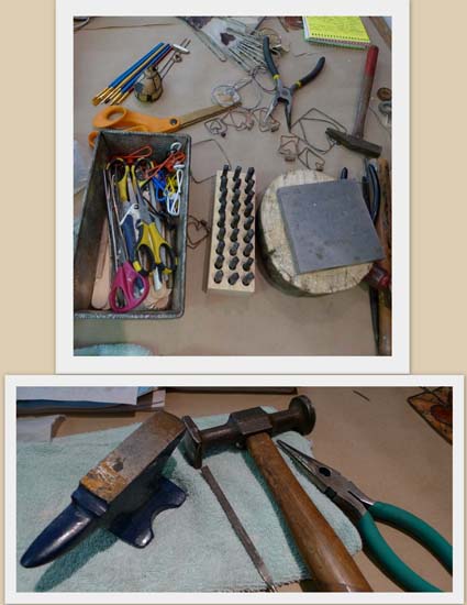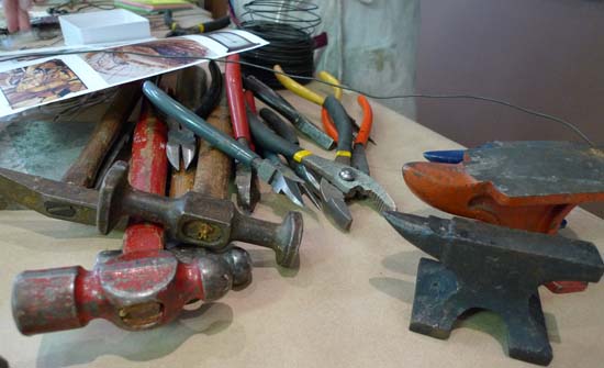 First, we were introduced to the tools we would need, wire of various gauges and metals, pliers to cut and shape, a hammer, an anvil, paper or fabric, and encaustic medium.