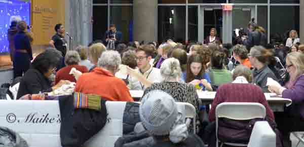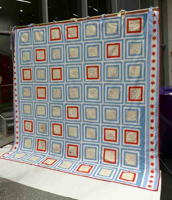 At 7 pm we gathered for the Sewing Circle at Segal Visitors Center. The completed first Witness Quilt was on display, framed by the lovely red borders it didn’t yet have in June.