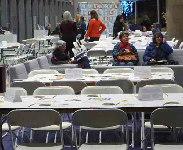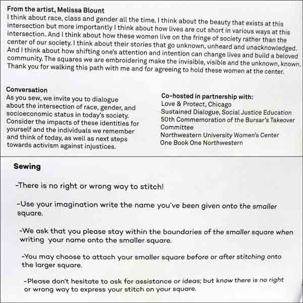 When I attended the unveiling of Melissa Blount’s Black Lives Matter Witness Quilt last year I knew I wanted to be part of future sewing circles. On January 31 that opportunity arose with an event at the Block Museum. In conjunction with an exhibit, people from all walks of life came to the Block Museum for an art making event.