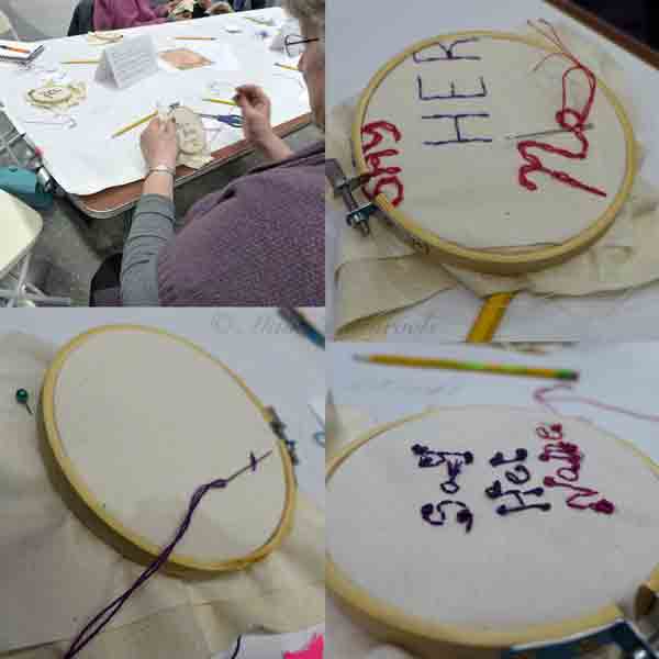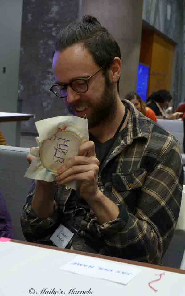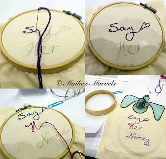The names of 30 interpersonal violence victims had been gathered. Because so many more attendees RSVPd than anticipated, each table was given two of these names, with the rest of us stitching “Say Her Name” to commemorate the women and girls who succumbed to domestic violence but would not be named on police reports.